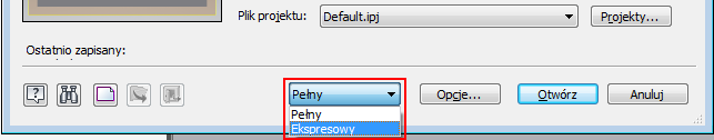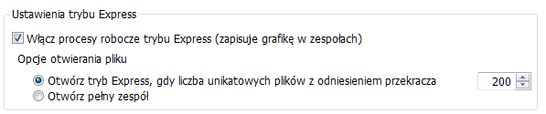Tryb Express jest opcją, którą trzeba włączyć. Gdy jest włączona, dostępne są dwie opcje otwierania. Wczytaj pełny zespół, która umożliwia wczytanie wszystkich danych komponentów i udostępnienie wszystkich poleceń. W przypadku dużych zespołów może to mieć negatywny wpływ na wydajność i czas przetwarzania. Lub Wczytaj ekspresowo, która umożliwia wczytanie tylko buforowanej grafiki i wyłączenie niektórych poleceń.