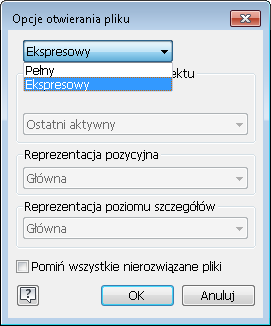 Zazwyczaj zespół jest otwierany w pełni (Wczytaj pełny zespół), co oznacza, że do pamięci są wczytywane wszystkie dane komponentów. W przypadku dużych zespołów w programie Inventor jest dostępny tryb Express (Wczytaj ekspresowo), w którym model otwiera się szybciej dzięki wczytaniu do pamięci tylko buforowanej grafiki komponentów.