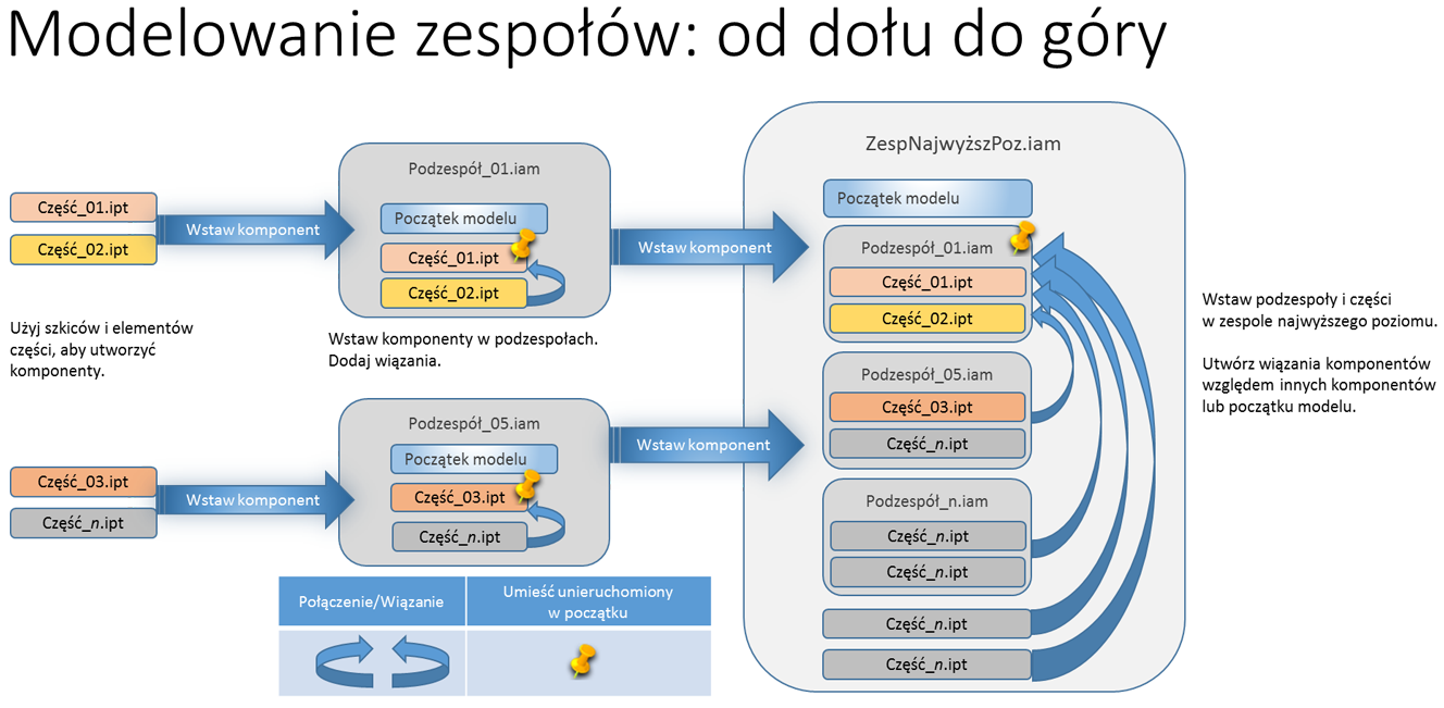 Tradycyjną metodą tworzenia zespołów jest metoda od dołu do góry. Najpierw należy zdefiniować różne części. Następnie umieszcza się je w podzespołach za pomocą wiązań zespołu. Podzespoły są później umieszczane w zespołach wyższego poziomu, aż do zespołu najwyższego poziomu i w ten sposób przechodzi się od dołu do góry. Ta metoda tworzenia zespołu pozwala otrzymać zespoły zawierające wiele relacji między częściami i zespołami.