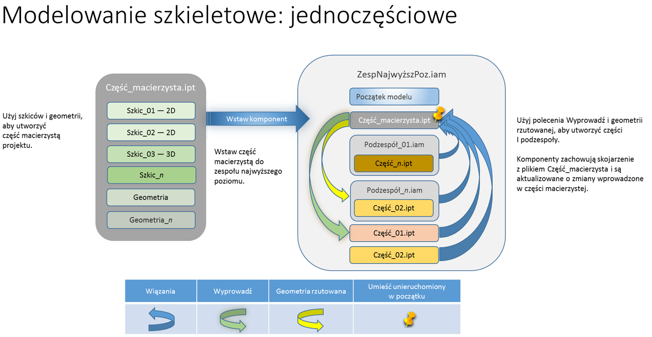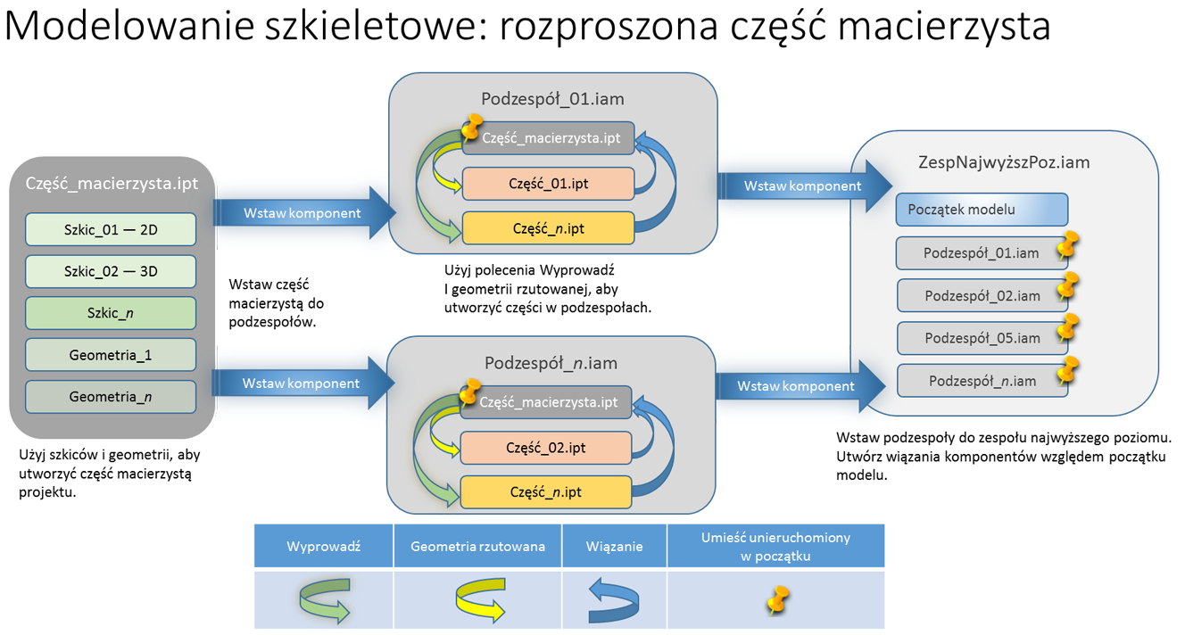 W procesie rozproszonej części macierzystej używana jest jedna część macierzysta, składająca się ze szkiców i geometrii, która definiuje końcowy zespół. Odniesienia do części macierzystej są używane w różnych podzespołach i częściach zgodnie z potrzebami. Część macierzysta steruje ogólnym układem. Zespół i podzespoły są definiowane lub umieszczane względem części macierzystej. Każdy podzespół ma własny szkielet i steruje częścią projektu wewnątrz siebie. Szkielety wyższego poziomu służą do sterowania ogólnym układem lub mechanizmem zespołu, a szkielety niższego poziomu mogą być używane do sterowania geometrią części.