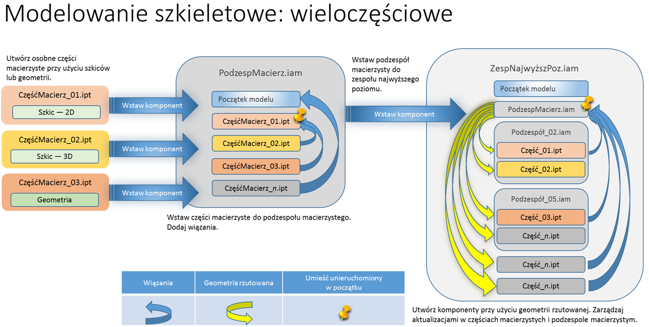W procesie wielopoziomowym używane są poszczególne części macierzyste złożone ze szkiców odwzorowujących końcowy zespół. Części macierzyste są umieszczane i wiązane w głównym podzespole. Główny podzespół jest umieszczany w zespole najwyższego poziomu. W zespole najwyższego poziomu poszczególne komponenty 3D są modelowane przy użyciu geometrii rzutowanej z głównego podzespołu i jego części macierzystych. Komponenty 3D mogą być zawarte w podzespołach logicznych lub oddzielne, zgodnie z wymaganiami projektu.