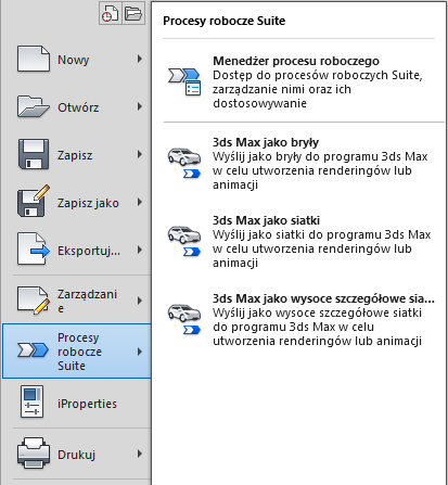 Proces roboczy Suite to mechanizm służący do eksportowania opracowanego projektu ze źródłowego produktu Autodesk do produktu docelowego w celu przeprowadzenia szczegółowego renderowania lub animacji. Ustawienia w procesie roboczym powodują automatyczne przekształcenie obiektów projektu do prezentacji w programie 3ds Max. Przykładowo: proces roboczy obejmujący renderowanie zewnętrzne w programie 3ds Max renderuje zewnętrzne powierzchnie projektu budynku, w tym światła i cienie. Procesów roboczych można używać do przygotowywania podglądu projektów i tworzenia sugestywnych prezentacji.