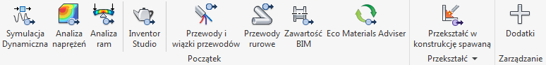 Uwaga: Środowiska Symulacja dynamiczna i Analiza naprężeń są dostępne w obu programach — Autodesk Simulation oraz Autodesk Inventor Professional. Środowiska: Kabel i wiązka oraz Przewody rurowe są dostępne jedynie w ramach programu Autodesk Inventor Professional.