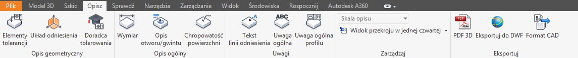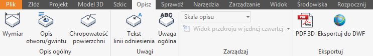 Użyj poleceń dostępnych na karcie Opisz w pliku części lub zespołu, aby dodać opisy 3D do modelu.