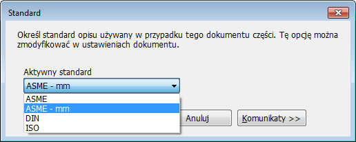 Zmiany na karcie Jednostka w oknie Ustawienia dokumentu nie wpływają na opisy 3D. Kliknij kartę Standardy w oknie Ustawienia dokumentu, a następnie wybierz opcję z listy Aktywny standard, aby ustawić jednostki. Jeśli podczas pierwszego użycia polecenia Opis 3D nie istnieje aktywny standard, zostanie wyświetlony monit o wybór standardu.