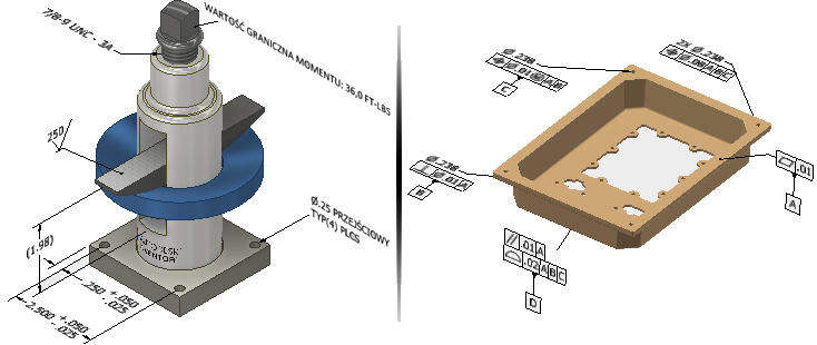 Opisy GD&T w modelu 3D opisują tolerancje, charakterystyki geometryczne i dopuszczalne odchylenie w modelu. Termin Definicja oparta na modelu (MBD) odnosi się do w pełni zdefiniowanego modelu 3D. Opisany model 3D jest często wysyłany bezpośrednio do produkcji, aby utworzyć część fizyczną.