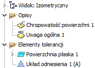Przeglądarka folderu zawiera listę wszystkich opisów (części i zespołów) oraz elementów tolerancji (tylko części) w pliku. Podświetlanie w oknie graficznym i przeglądarce jest dostępne dla opisów i elementów tolerancji.
