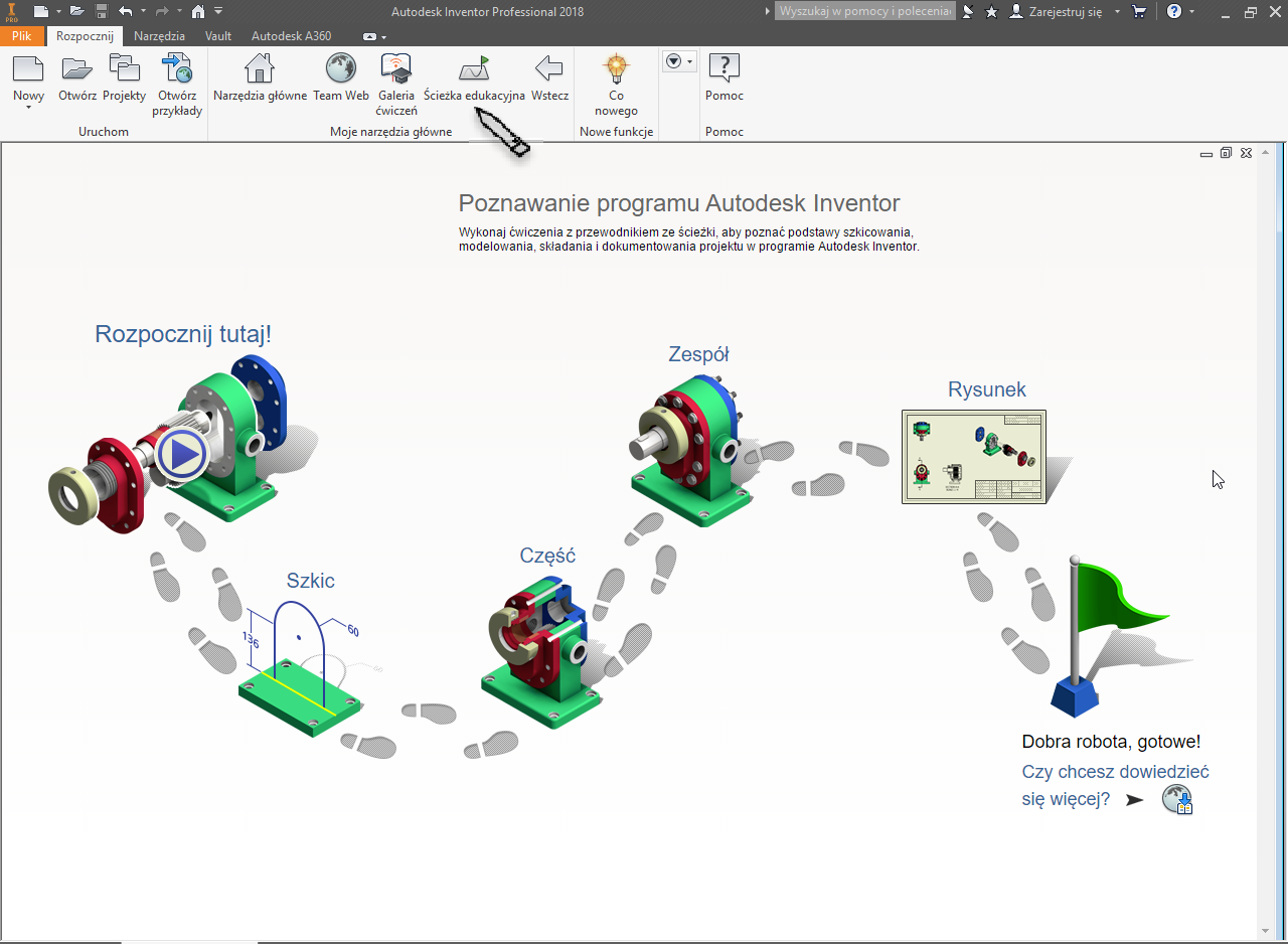 Ćwiczenia z przewodnikiem zawarte w instalacji produktu to doskonały sposób na rozpoczęcie pracy. Ten zestaw podstawowych ćwiczeń pokazuje pełen proces roboczy od podstawowego szkicowania do dokumentowania projektu. Dostęp do tych ćwiczeń można uzyskać, klikając ścieżkę edukacyjną na karcie Rozpocznij w panelu Moje narzędzia główne na wstążce.