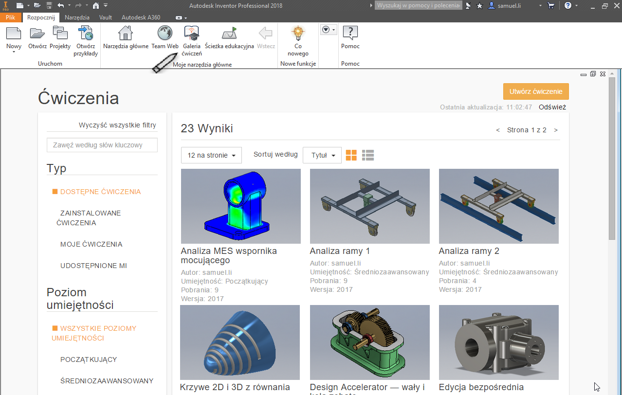 Uwaga: Ćwiczenia z przewodnikiem nie są dostępne w programie Inventor LT.