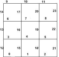 For faces in a mesh, you can attach color, layer, GS marker, normal, and visibility traits. To assign properties to faces in a mesh, you list the values for the faces in row-order, as indicated by the following figure:
