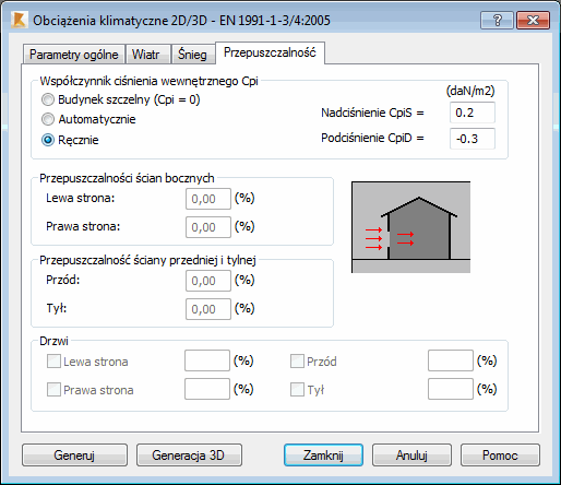 Okno to służy do definicji przepuszczalności ścian w konstrukcji. Przepuszczalności ścian mają bezpośredni wpływ na generację współczynników ciśnienia wiatru wewnątrz konstrukcji. Po wybraniu przez użytkownika opcji w oknie w prawym, górnym rogu okna prezentowana jest ikona, która schematycznie przedstawia wybraną opcję.