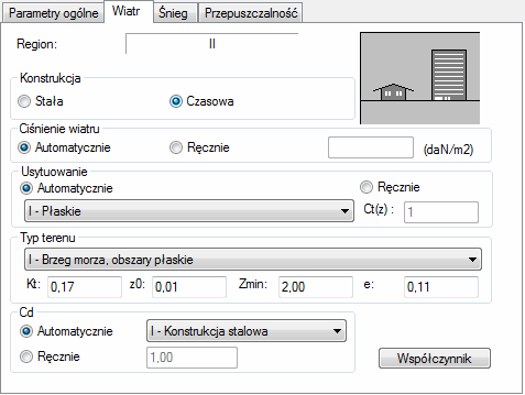Naciśnięcie przycisku Współczynniki powoduje otwarcie okna dialogowego, w którym określone mogą zostać współczynniki dla obciążenia wiatrem.