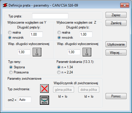 W polu Typ pręta podawana jest nazwa wybranego typu pręta (można wpisać w tym polu dowolną nazwę typu pręta). W polach Wyboczenie względem osi Y lub Z wprowadzona może zostać długość pręta dla odpowiedniej płaszczyzny. Istnieją dwa sposoby podania tej długości: