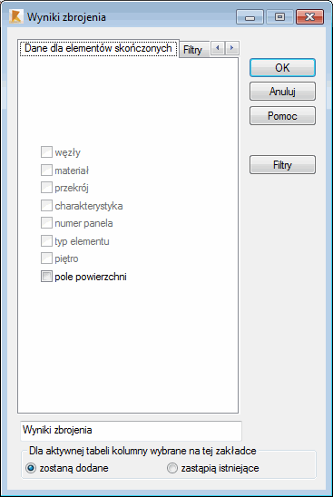 Wybierz kartę Dane dla elementów skończonych w oknie dialogowym Powierzchnie zbrojenia, aby wybrać: