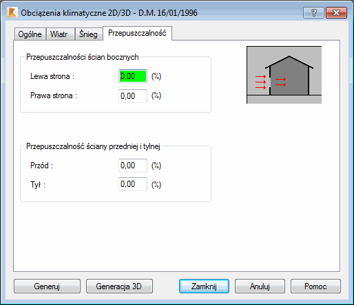 Okno to służy do definicji przepuszczalności ścian w konstrukcji. Przepuszczalności ścian mają bezpośredni wpływ na generację współczynników ciśnienia wiatru wewnątrz konstrukcji. Po wybraniu przez użytkownika opcji w oknie w prawym, górnym rogu okna wyświetlana jest ikona, która schematycznie przedstawia wybraną opcję.