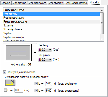 Dla prętów poprzecznych wybiera się preferowany kształt strzemienia lub szpilki. Podobnie dokonuje się ustawień kształtu (zakończenia) prętów podłużnych z rozróżnieniem na pręty główne i konstrukcyjne. Dla każdego z końców pręta istnieje możliwość wyboru typu zakończenia w postaci haka o dowolnym kącie zagięcia.