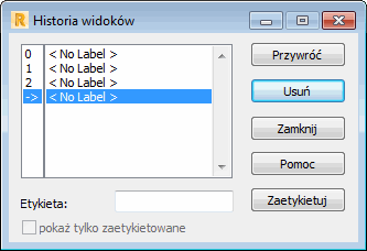 Do listy znajdującej się w powyższym oknie dialogowym dopisywane są kolejne widoki konstrukcji otrzymane po wykonaniu operacji powiększania (pomniejszania), przesunięcia lub obrotu konstrukcji, rzutowania konstrukcji na różne płaszczyzny oraz wizualizacji atrybutów konstrukcji takich jak podpory, przekroje, obciążenia itp. Aby nazwać wybrany widok należy wpisać jego etykietę, a następnie nacisnąć przycisk Zaetykietuj. Nazwa widoku zostanie dopisana na liście widoków. By powrócić do wcześniejszego widoku konstrukcji, należy dwukrotnie kliknąć lewym przyciskiem myszy wybrany widok na liście aktywnej lub podświetlić ten widok i nacisnąć przycisk Przywróć.