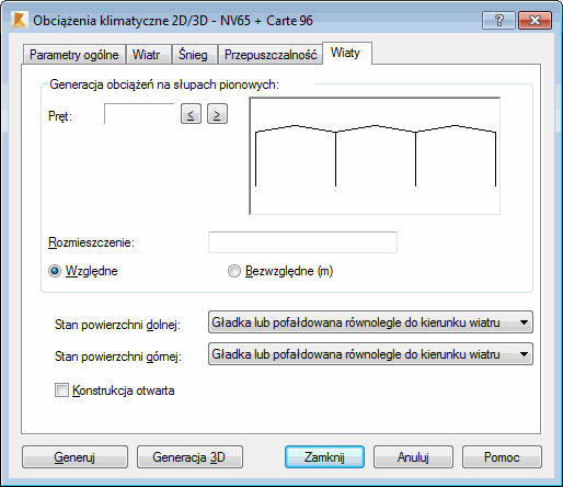 - Stan powierzchni ścianek dolnych i górnych przykrycia. Jest to informacja potrzebna, aby obliczyć siłę podłużną wywołaną tarciem o dach dla przypadków wiatrowych z przodu do tyłu i z tyłu do przodu.