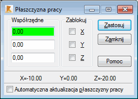 W dolnej części okna wyświetlane są aktualne współrzędne kursora. Jeśli opcja Automatyczna aktualizacja płaszczyzny pracy jest włączona, to położenie punktu pracy (a co za tym idzie i płaszczyzny pracy) zmienia się; punkt pracy jest przyjmowany jako ostatnio zdefiniowany punkt (np. koniec definiowanego pręta). Jeżeli opcja jest wyłączona, to punkt określający płaszczyznę pracy jest definiowany w powyższym oknie dialogowym (i nie zmienia się podczas definicji elementów konstrukcji).