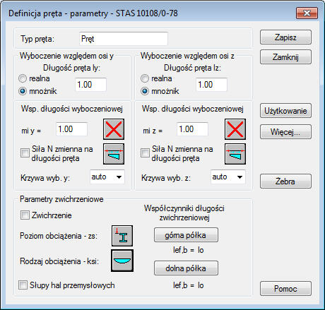 Po naciśnięciu przycisku Więcej na ekranie pojawia się dodatkowe okno dialogowe, w którym zdefiniowane mogą zostać pozostałe parametry typu pręta określone w normie, takie jak: współczynniki momentu zastępczego, parametry przekroju itp.