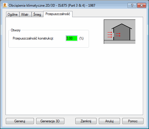 Okno to służy do definicji całkowitej przepuszczalności konstrukcji. Wartość przepuszczalności ma wpływ na wartość współczynników Cpi.