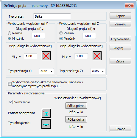 - Współczynniki długości wyboczeniowej (Y i Z)