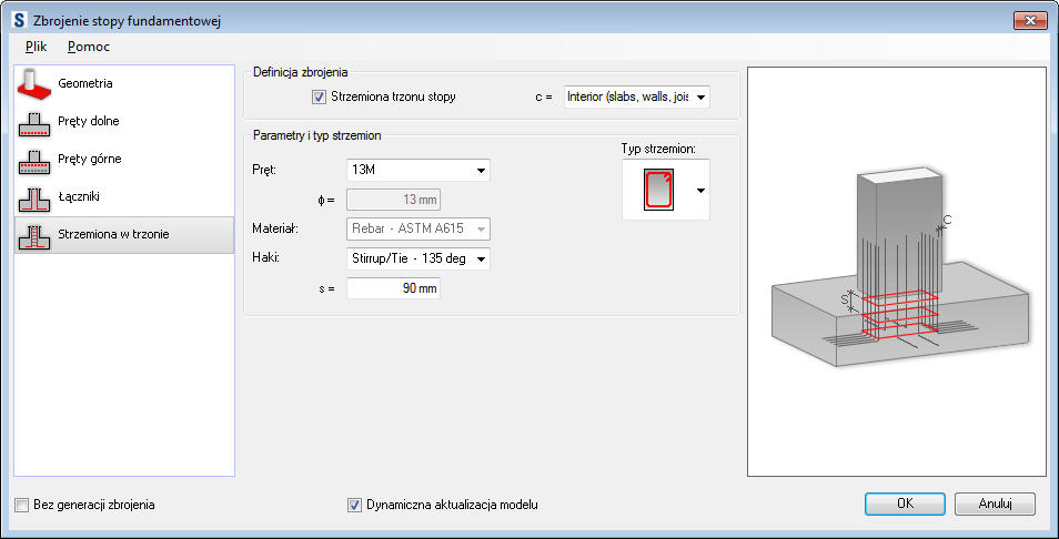 Aby wygenerować zbrojenie strzemieniowe, w polu Definicja zbrojenia należy wybrać pozycję Strzemiona trzonu stopy. Następnie można zdefiniować parametry strzemion: