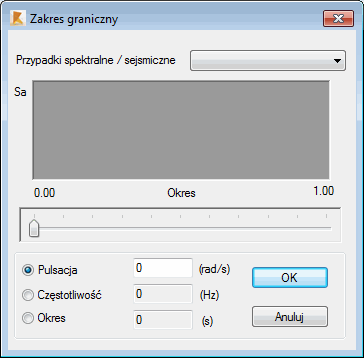 W polu Przypadki spektralne/sejsmiczne prezentowane są wszystkie przypadki analizy sejsmicznej i spektralnej konstrukcji zdefiniowane dla wybranej analizy modalnej. Po wybraniu jednej z analiz sejsmicznych lub spektralnych w górnej części okna w odpowiednim polu prezentowane jest spektrum wybranej analizy.