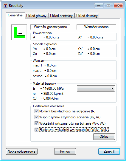 Opcja rozpoczyna obliczanie właściwości geometrycznych zdefiniowanego przekroju bryły.