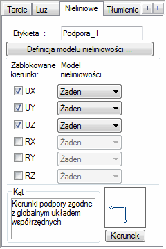 W prawym, dolnym rogu okna przedstawiany jest schematyczny rysunek definiowanej podpory. Pod rysunkiem znajduje się przycisk Kierunek; jego naciśnięcie powoduje otwarcie okna dialogowego Kierunek podpory, w którym zdefiniowany może zostać kierunek lokalnej osi x podpory. Kierunek osi jest określany poprzez skierowanie go do punktu, węzła lub obrócenie podpory względem dowolnej osi globalnego układu współrzędnych.