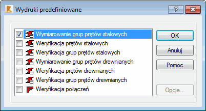 Po wybraniu (podświetleniu) nazwy notki obliczeniowej i naciśnięciu przycisku Opcje na ekranie pojawia się dodatkowe okno dialogowe. W nim użytkownik może wybrać te części notki obliczeniowej, które mają być drukowane.