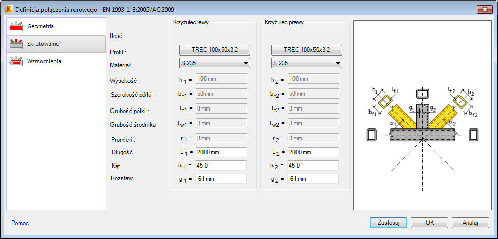 W dolnej części okna dialogowego zdefiniowana może zostać grubość spoin krzyżulców i słupka.