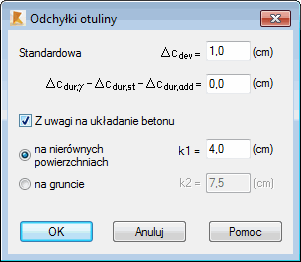 Jeśli norma EN 1992—1—1:2004 AC:2008 jest wybrana, można określić wartości odchyłek otuliny w następującym oknie dialogowym.