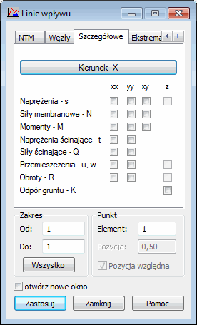 Opcje w powyższym oknie dialogowym pozwalają użytkownikowi na określenie wielkości dla konstrukcji powierzchniowej (płyta, powłoka), dla której prezentowane będą linie wpływu: