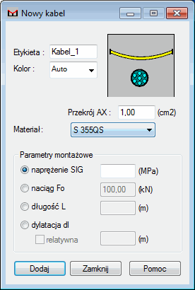 Uwaga: Opcje Naprężenie, Siła, Długość i Dylatacja wzajemnie się wykluczają i nie są obowiązkowe (jeżeli użytkownik nie poda żadnego z tych parametrów, to długość nieobciążonego cięgna jest równa odległości pomiędzy węzłami).