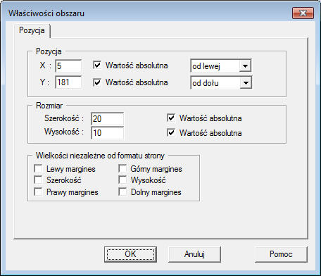 Karta Położenie zawiera te same opcje co analogiczna karta w oknie dialogowym Właściwości tekstu. Dodatkowo można określić rozmiar widoku i wskazać, które wartości są niezależne od formatu strony (w konfiguracji domyślnej, gdy format strony ulegnie zmianie, wszystkie wartości są odpowiednio przeliczane przez moduł wydruku programu Robot).