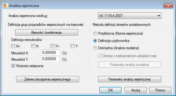 W dolnej części okna dialogowego znajdują się przyciski Zakres obciążenia sejsmicznego oraz Parametry analizy sejsmicznej.