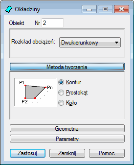 W części okna dialogowego nazwanej Metoda tworzenia znajdują się opcje umożliwiające wybór metody definiowania okładziny (kontur, prostokąt, koło); metoda zależy od wyboru odpowiedniej opcji.