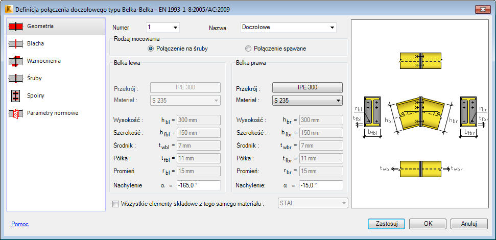 W środkowej części okna dialogowego prezentowane są parametry geometryczne i materiałowe belek, dla których utworzone ma zostać połączenie.