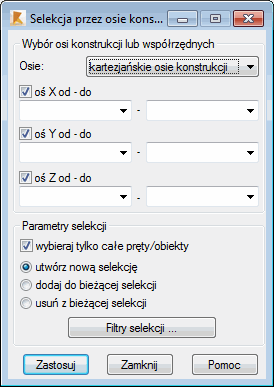 W górnej części okna dialogowego można wybrać typ osi konstrukcji (układ kartezjański lub cylindryczny). Poniżej określony może zostać zakres selekcji elementów konstrukcji wzdłuż osi X, Y i Z globalnego układu współrzędnych. Należy określić początkowe i końcowe położenie osi konstrukcji, podając przedział selekcji prętów lub obiektów.
