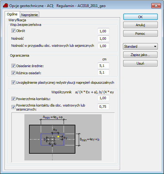 W powyższym oknie dialogowym można wybrać warunki określające sposób wymiarowania fundamentu. Zawartość powyższego okna dialogowego zależy od wybranej normy geotechnicznej (wymiarowania fundamentów).