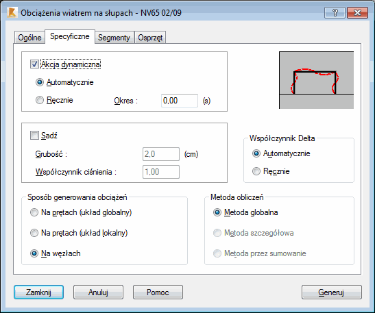 - Opcja Akcja dynamiczna wiatru — umożliwia włączanie/wyłączanie uwzględniania efektów dynamicznych podczas generacji obciążeń. Dodatkowo istnieje możliwość automatycznego uwzględnienia efektów dynamicznych przez program przy podanym okresie drgań własnych konstrukcji.