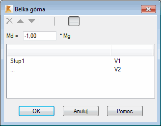 W menu modułu Projektowanie słupa żelbetowego znajduje się opcja Belka górna. Po wyborze tej opcji na ekranie pojawia się okno dialogowe, w którym dokonany może zostać wybór dokładnie jednej belki z listy zdefiniowanych belek.