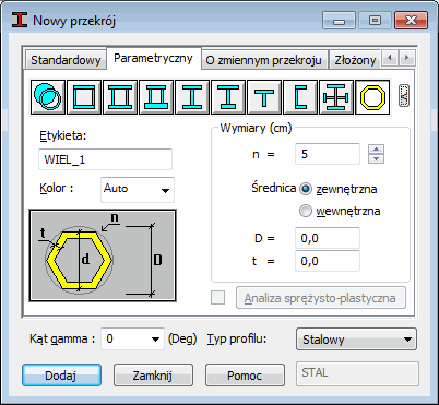 Uwaga: Jeżeli tworzony ma być pełny przekrój okrągły lub prostokątny, to należy przyjąć grubość ścianki T = 0.