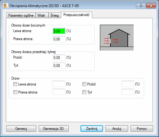 Okno to służy do definicji przepuszczalności ścian w konstrukcji. Przepuszczalności ścian mają bezpośredni wpływ na generację współczynników ciśnienia wiatru wewnątrz konstrukcji. Po wybraniu przez użytkownika opcji w oknie w prawym, górnym rogu okna prezentowana jest ikona, która schematycznie przedstawia wybraną opcję.