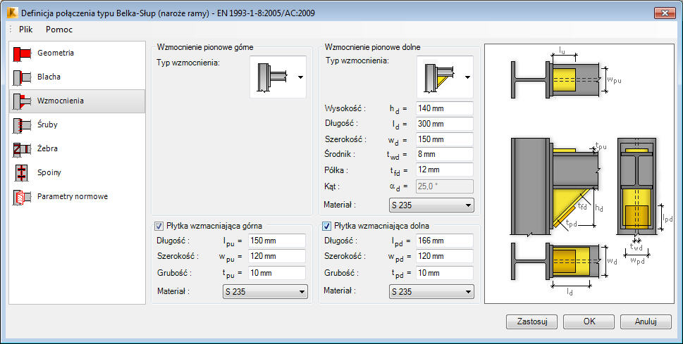 W zakładce Wzmocnienia znajdują się opcje pozwalające na definiowanie różnych typów wzmocnienia między półkami belki a blachą doczołową.