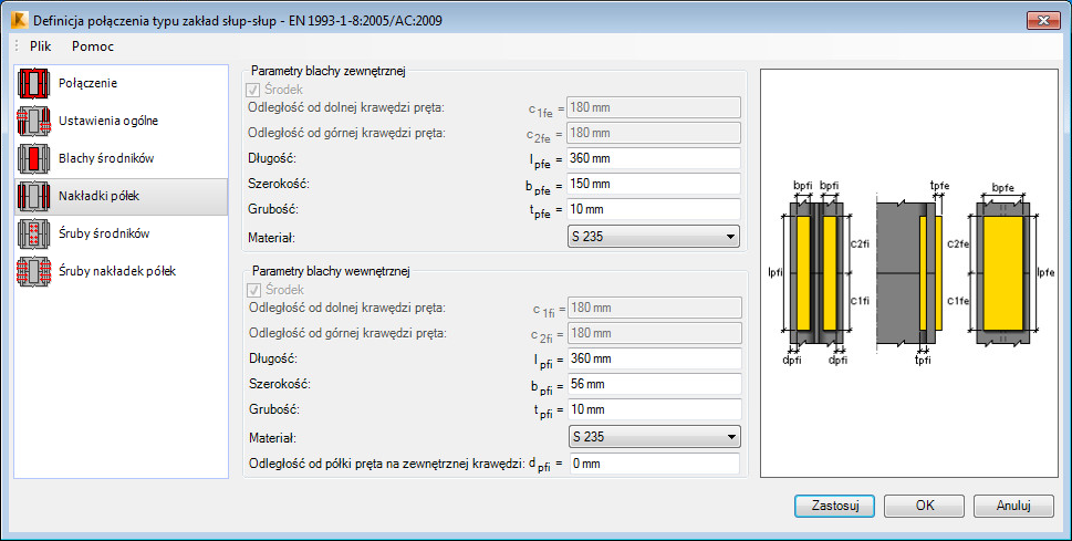 - Górne półki i Dolne półki dla połączeń belka-złącze belki