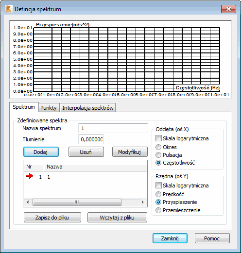 Użytkownik może wybrać wielkości, których wartości będą służyły do definicji spektrów. Może tego dokonać odpowiednio w polach: Odcięta (oś X) i Rzędna (oś Y). Na osi odciętych definiowane mogą być wartości okresu częstotliwości lub pulsacji, natomiast na osi rzędnych wartości przyspieszenia, prędkości lub przemieszczenia. Wartości prezentowane na obu osiach mogą być również przedstawiane w skali logarytmicznej. Użytkownik może zdefiniować kilka widm.