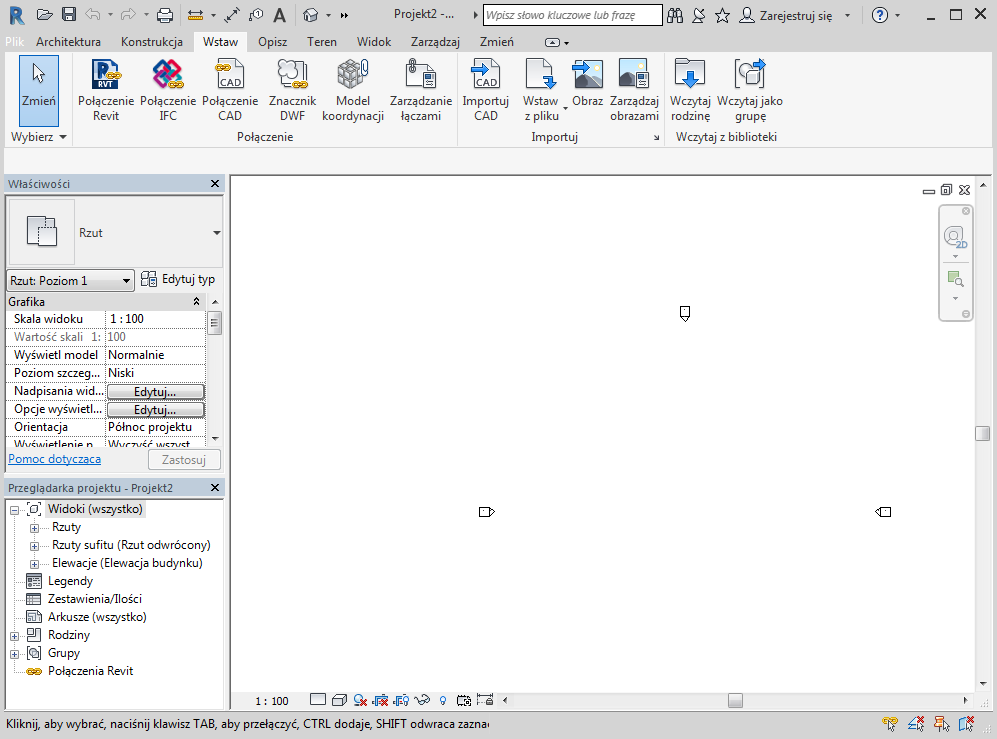 Obszar rysunku przedstawia widoki (oraz arkusze i zestawienia) bieżącego projektu. Widok otwierany w projekcie jest zawsze wyświetlany domyślnie w obszarze rysunku na wierzchu pozostałych otwartych widoków.