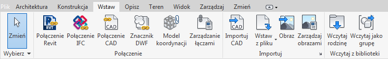 Wstążka jest wyświetlana podczas tworzenia lub otwierania pliku. Zawiera ona wszystkie narzędzia potrzebne do utworzenia projektu lub rodziny.